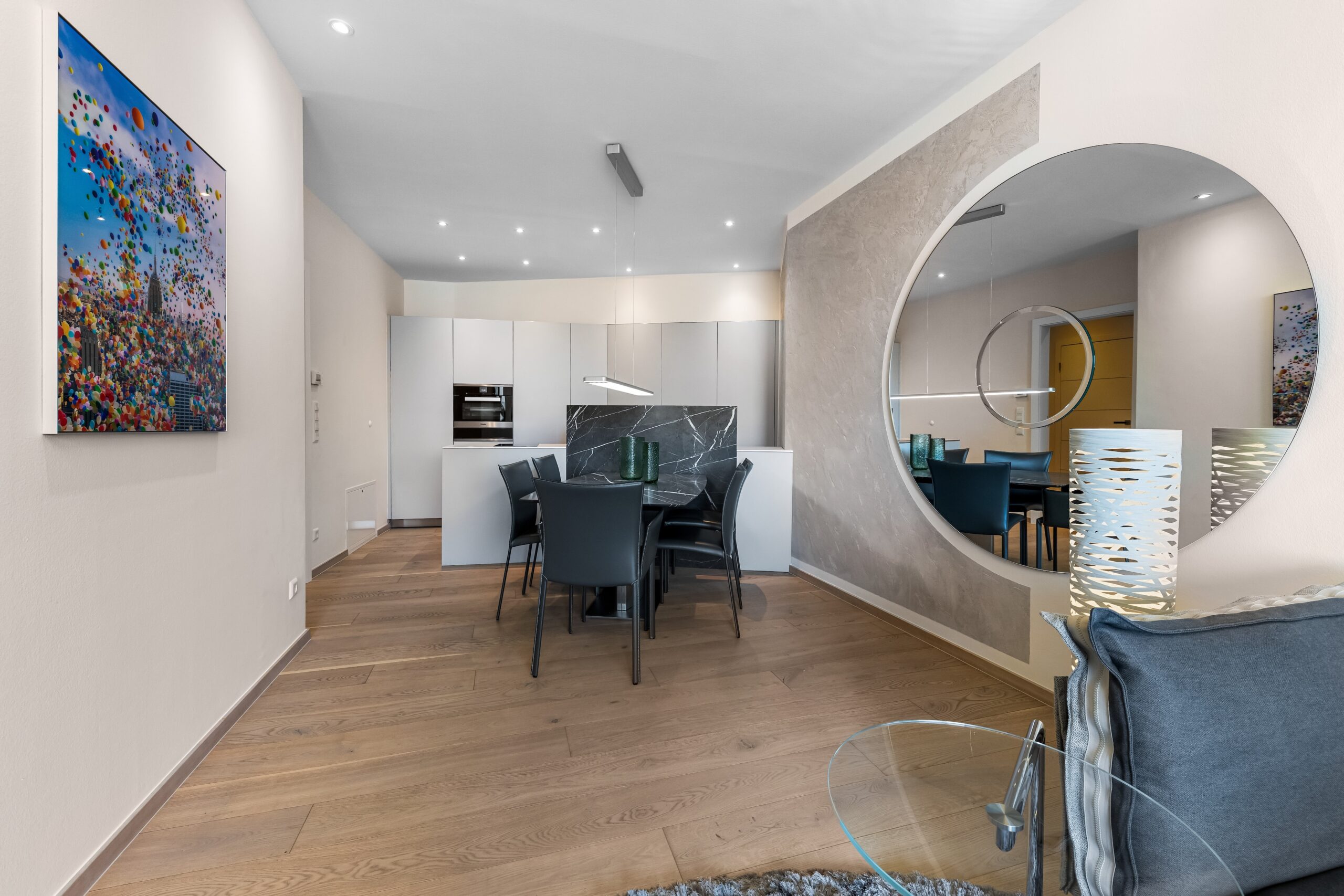 Hochwertige, maßgefertigte Einbauschränke sowie eine exklusive, voll ausgestattete Einbauküche fügen sich harmonisch in das stilvolle Gesamtbild ein und bieten höchsten Komfort in edlem Design. Jeder Raum wurde mit viel Liebe zum Detail geplant und mit ausgesuchten Materialien ausgestattet, welche der Wohnung eine zeitlose Modernität und zurückhaltende Eleganz verleihen.