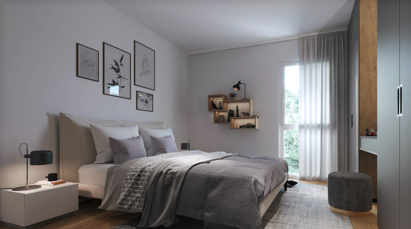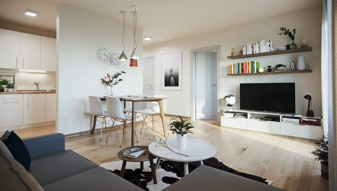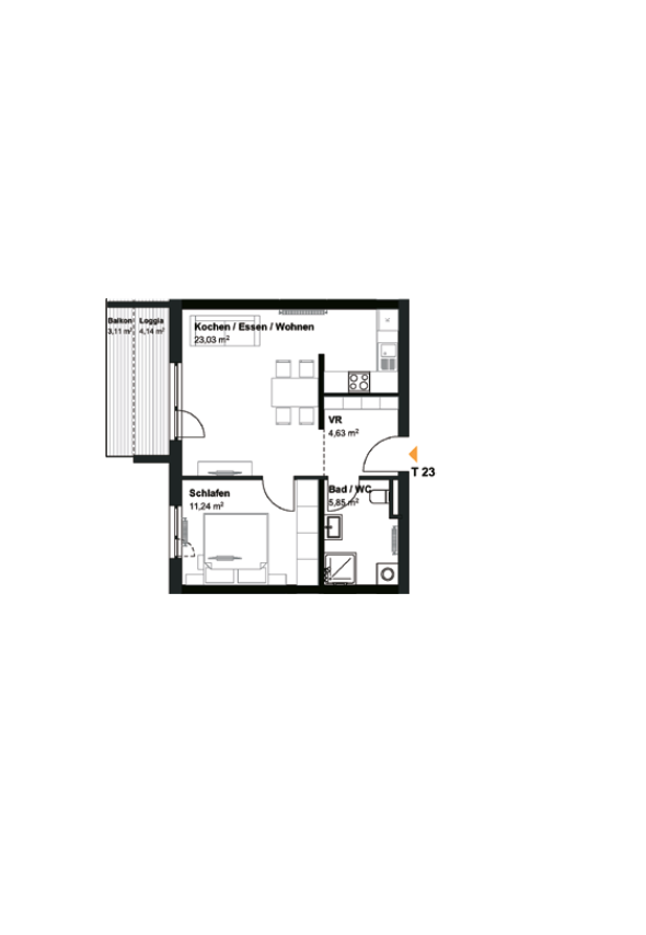 Der durchdachte Grundriss umfasst einen Vorraum mit praktischen Einbauschränken, einen großzügigen Wohn- und Essbereich mit Platz für eine gemütliche Couch, einen Esstisch sowie ein TV-Board. Die integrierte, zeitlose Einbauküche fügt sich harmonisch in den Raum ein. Das Schlafzimmer bietet ausreichend Platz für ein großes Bett und einen Kleiderschrank. Das Badezimmer ist mit Dusche, WC und Spiegelschrank ausgestattet. Die Loggia lädt zum Entspannen im Freien ein und erweitert den Wohnraum auf angenehme Weise.
